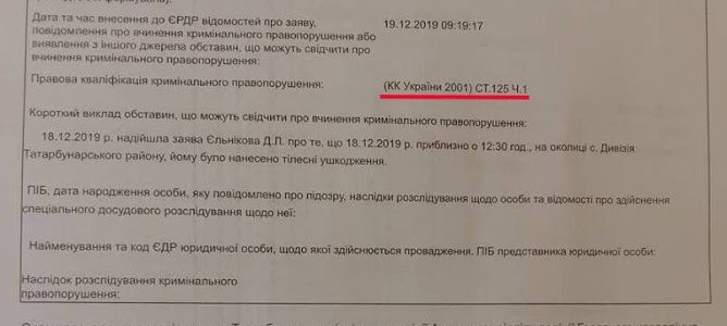 Иван Русев подчеркнул, что на следующий день после случившегося инспектор Нацпарка зашел в полицию забрать уведомление о регистрации его заявления и открытии криминального производства. Однако вместо ст. 345 «Угроза или насилие по отношению к сотрудникам правоохранительного органа» полицейские открыли производство по статье 125 «Умышленное легкое телесное повреждение».