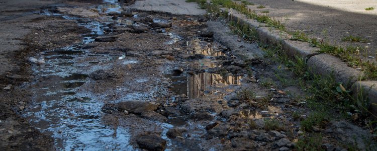 Коллектор до конца не отремонтирован, как и дорожное покрытие: огромные дыры просто засыпали щебнем, который смоет первым же сильным дождем. Сейчас здесь течет черный ручей с характерным запахом.