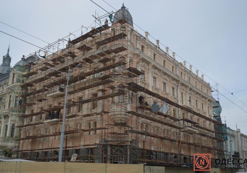Как передаёт корреспондент Одесса News, строители уже убрали часть лесов и маскировочную сетку со стороны улицы Преображенской, и взору одесситов и гостей города предстала часть здания, поменявшего горчично-жёлтый цвет на песочно-персиковый.