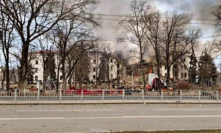 Под вечер самолет ВВС РФ в Мариуполе разбомбил драматический театр. Как сообщили очевидцы, сверхмощная бомба полностью уничтожила здание театра. Внутри находились сотни людей, в том числе с маленькими детьми. Театр был одним из убежищ от обстрелов.