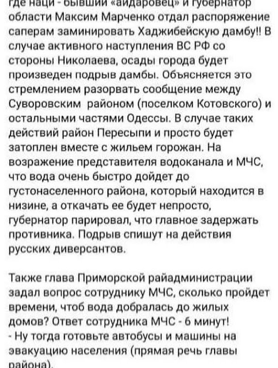 В соцмережах Одеси розповсюджують фейк російських спецслужб о замінуванні Хаджибейської дамби. Ніби то за розпорядження Начальника Одеської ОВА Максима Марченка її було заміновано, щоб підірвати, коли наблизяться війська окупанта.