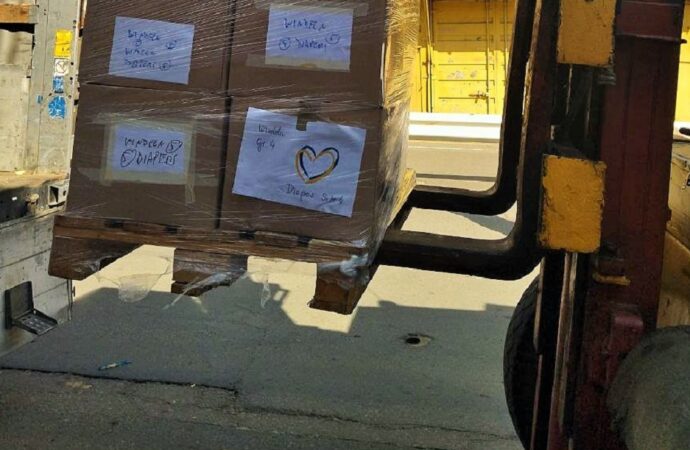 В благотворительном грузе – около 10 тонн детского питания, памперсов, одеял, постельных принадлежностей, одежды, бытовой химии, средств гигиены, дезинфекторов. А также — карематы, спальники, костыли, медикаменты, перевязочный материал.
