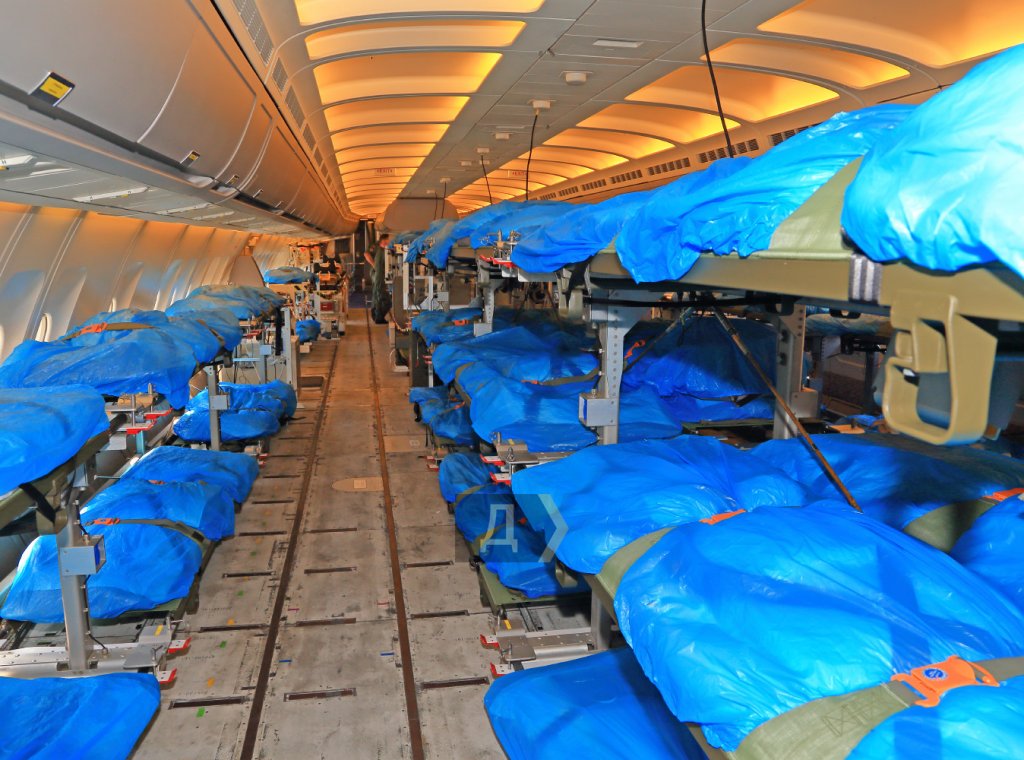 Внутри самолета может разместиться максимально 56 раненых детей и взрослых или шесть модулей для интенсивной терапии плюс 38 мест для людей с менее серьезными травмами.