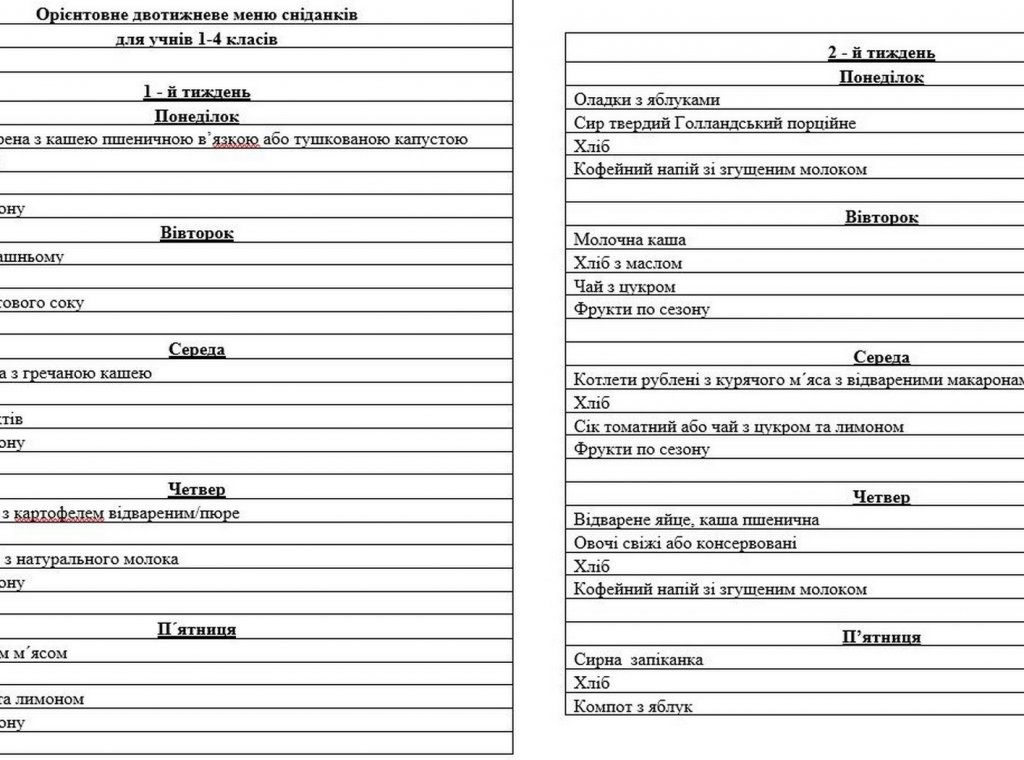 Кроме этого, новый поставщик должен строго придерживаться еженедельного меню, согласованного с Госпродпотребслужбой Украины. Новый поставщик будет работать всего 37 дней. Каждый день он должен будет готовить завтраки для 2073 учеников 1-4 классов и обеды для 135 льготников.