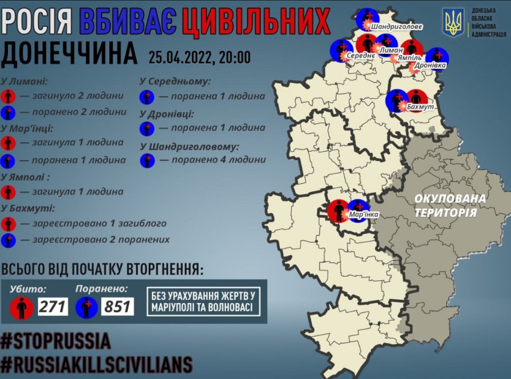 Четверо мирных жителей погибли в результате вражеских обстрелов Донецкой области 25 апреля — двое в Лимане, один в Марьинке и один в Ямполе.