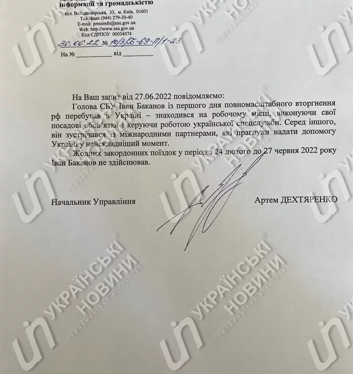 "Глава СБУ Иван Баканов с первого дня полномасштабного вторжения России находился в Украине – находился на рабочем месте, выполняя свои должностные обязанности и руководя работой украинской спецслужбы", - говорится в ответе.