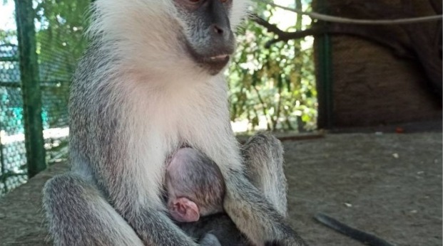 У зеленых мартышек родился малыш. Его пока оберегает мать и носит все время с собой.