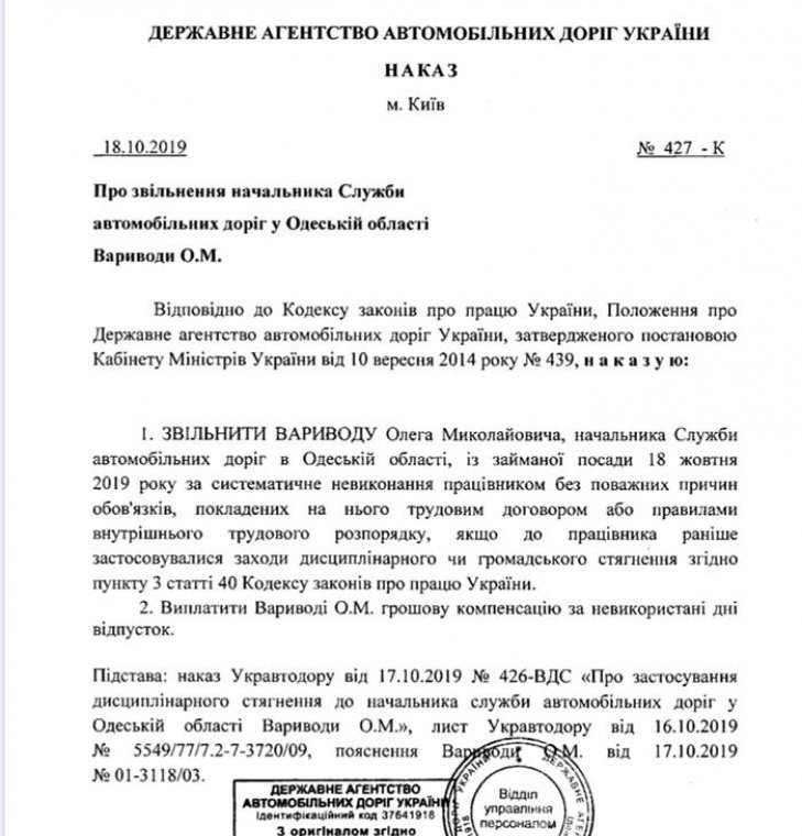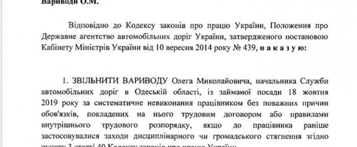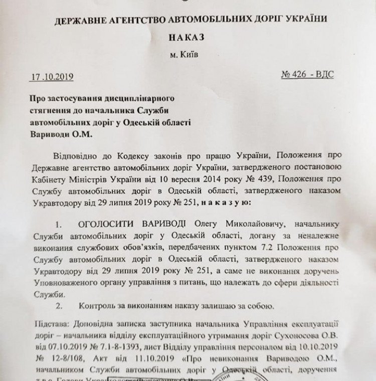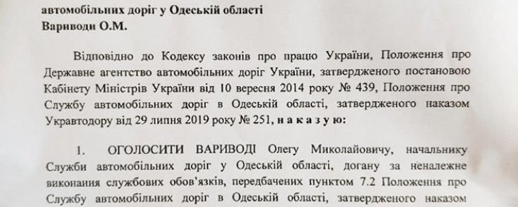 Руководитель Службы автодорог Одесской области Олег Варивода получил выговор и был уволен с занимаемой должности.
