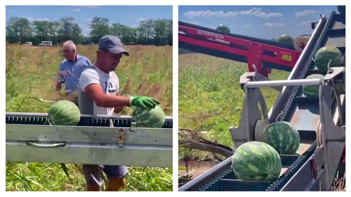 На юге Одесской области начали убирать арбузы. Их так много уродило, что в местной компании Дунайский аграрий решили впервые приобрести конвейер для сбора урожая. Транспортерная лента тянется за трактором перпендикулярно направлению движения. Это дает возможность не только скорей проводить сбор урожая, но и делать это с минимальными повреждениями самих арбузов.