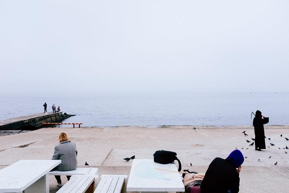 На Ланжероне сегодня замечен интересный персонаж — женщина в черной одежде с косой, которая кормила голубей.