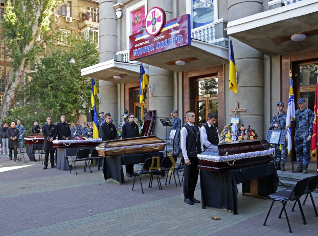 Прощання з чотирма українськими воїнами, які загинули в боях на херсонському напрямку, відбулося біля одеського Будинку офіцерів.
