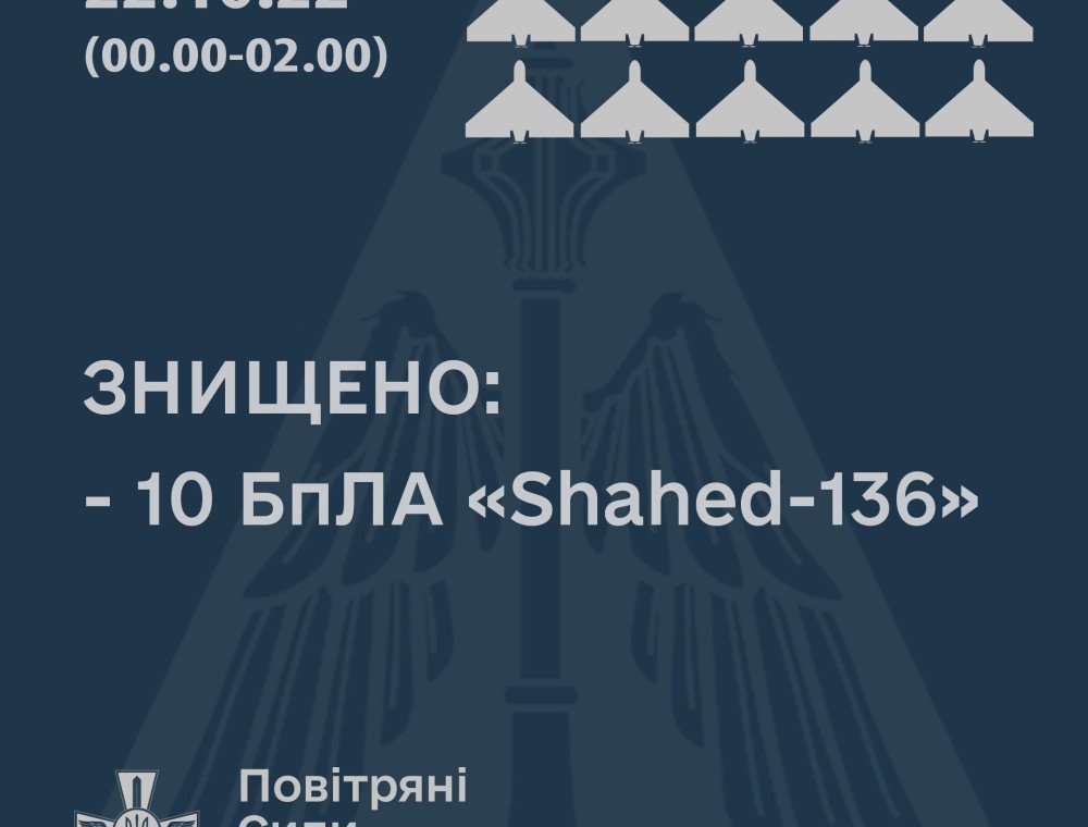 Уночі з 21 на 22 жовтня ППО повітряного командування «Південь» збила над Миколаївщиною десять безпілотників-камікадзе типу Shahed-136.