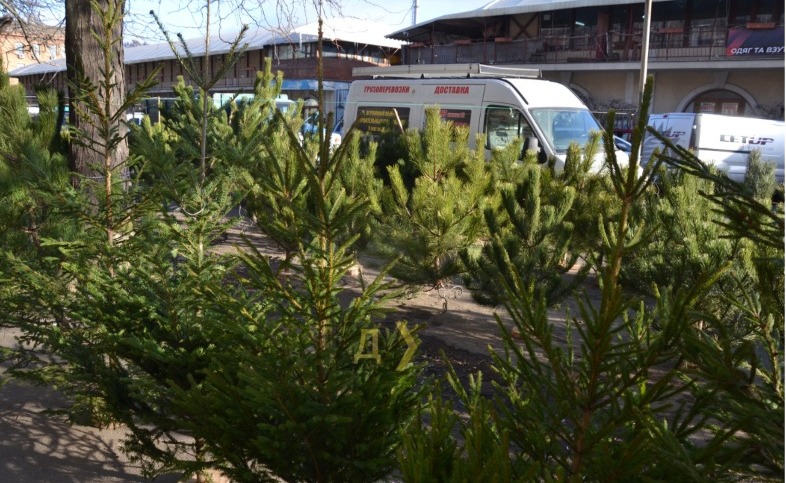 На углу Коблевской и Конной один такой пункт реализации раскинулся на добрых 30-40 метров. Продукция аккуратно разложена и отсортирована по размерам, продавцы говорят, что сосенки и елочки родом из Днепропетровской области. Деревья не чипированы, следовательно, законность их вырубки сомнительна.