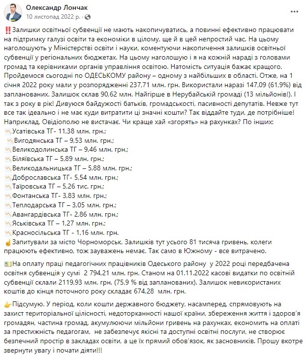 Освітня субвенція, яка надається місцевим бюджетам для нарахування зарплатні вчителям, і яка накопчилася у попередні роки, з 1 січня 2023 року повернута до держбюджету. Про те, що невикористані кошти на рахунках громад ризикують бути вилученими, неодноразово попереджав освітян керівник Департаменту освіти та науки Одеської ОВА Олександр ЛОНЧАК. Проте декілька громад в області не дослухались порад профільного керівника, а тому залишились без “запасних” грошей.