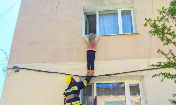 Сегодня около 12 дня в Килии прохожие заметили висевшего за окном ребенка. Они вызвали работников ГСЧС, увидевших 9-летнюю девочку, которая едва держалась за подоконник на втором этаже, а ногами стояла на свертке интернет кабелей. С помощью выдвижной стремянки спасатели сняли девочку с высоты.