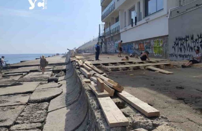 В Одессе наконец-то занялись провалом на Трассе здоровье в районе Аркадии. Этот провал образовался на побережье у пляжа с плитами. Сейчас опасный участок накрывают деревянным помостом. А пока продолжаются работы, все отдыхающие и прохожие вынуждены обходить дорогу по разбитым неровностям «пляжа с плитами».