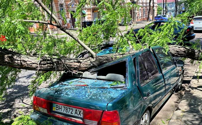 Сегодня в центре Одессы на улице Торговой огромная ветка дерева упала на автомобиль, сообщает телеграм-канал “Худесса” со ссылкой на очевидцев. Судя по опубликованным фото, автомобиль практически полностью раздавлен – повреждена крыша, капот и багажник, разбито лобовое и заднее стекло.