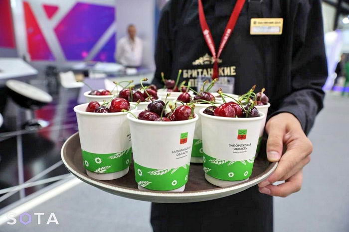На опублкиованных фото черешню раздают в красно-белых коробках и бело-зеленых стаканах. На упаковке можно рассмотреть надписи “отборная черешня”, “экопродукт”, “мелитопольская черешня” и “выращено в России”. На стенде Запорожской области стоит огромная чаша из отборной крупной черешни.