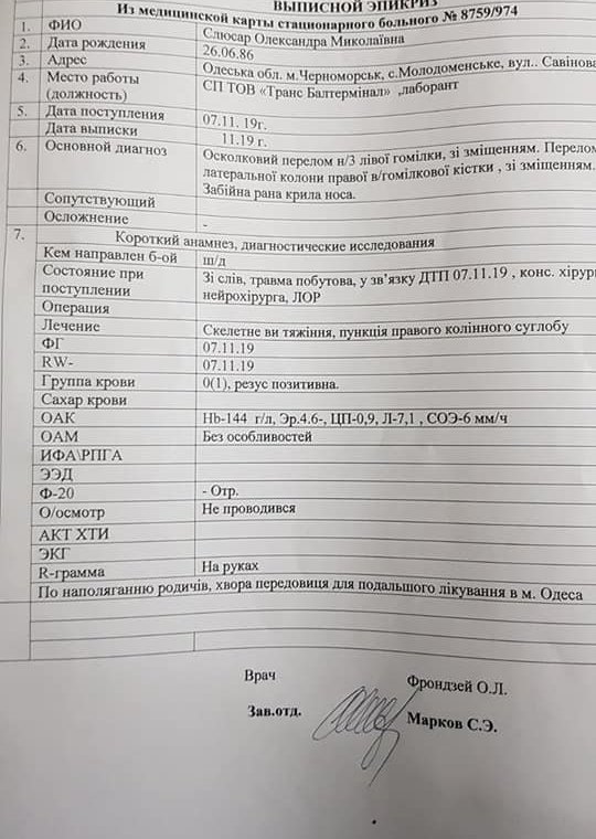 Александра Слюсарь попала в ДТП 7 ноября на автодороге М-14 «Одесса-Мелитополь-Новоазовск», возле села Половинки, Николаевского района. У девушки тяжкие телесные повреждения: перелом одной ноги в трех местах и перелом второй в двух местах. Операция назначена девушке в ближайший вторник, 12 ноября, в Одессе. Цена такой операции 50 тысяч гривен. Друзья и родные просят помощи у всех неравнодушных к жизни девушки: «В результате ДТП наша Санечка получила тяжкие телесные повреждения: перелом одной ноги в 3ех местах и перелом второй в двух местах. Цена только 1ой операции, к которой готовится семья в ближайший вторник, составляет - 50 000 ГРН. На данный момент её перевозят с г. Николаев в г. Одесса. Предварительный диагноз врачей г. Николаев публикуем. Все необходимые врачебные документы будут опубликованы дополнительно! ОЧЕНЬ НУЖНА ФИНАНСОВАЯ ПОМОЩЬ СЕМЬЕ В ЛЕЧЕНИИ», - пишет подруга пострадавшей.