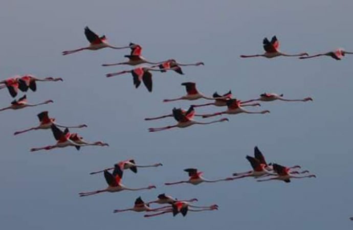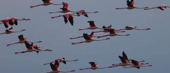 По его словам, в этот период летом более 500 розовых фламинго и примерно столько же розовых пеликанов каждый день путешествуют с востока на запад Тузловских лиманов в поисках пищи.