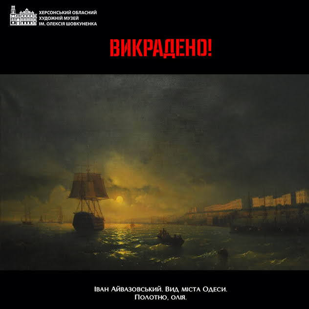 Из Херсонского художественного музея во время оккупации российские оккупанты-мародеры похитили три картины известного украинского художника армянского происхождения Ивана Айвазовского. Как сообщили в музее, похитили картины «Буря утихает», «Вид города Одессы» и «Море». Среди них наиболее известный – это ночной пейзаж Одессы и порта под лунным сиянием середины 19-го века.