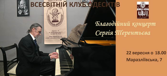 22 жовтня у вітальні Всесвітнього клубу одеситів виступає легендарний одеський піаніст Сергій Терентьєв! Напочатку осені Маестро виконає вишукані зразки романтичної фортепіанної літератури – п’ять етюдів Фредеріка Шопена, а також вперше презентує Фантазію – експромт. За багаторічною традицією у другій частини концертної програми Маестро подарує джазові імпровізації. Глядачів запрошують у ВКО 22 вересня за адресою: вул. Маразліївська, 7, Початок концерту 18.00. Благодійний внесок – від 300 грн.