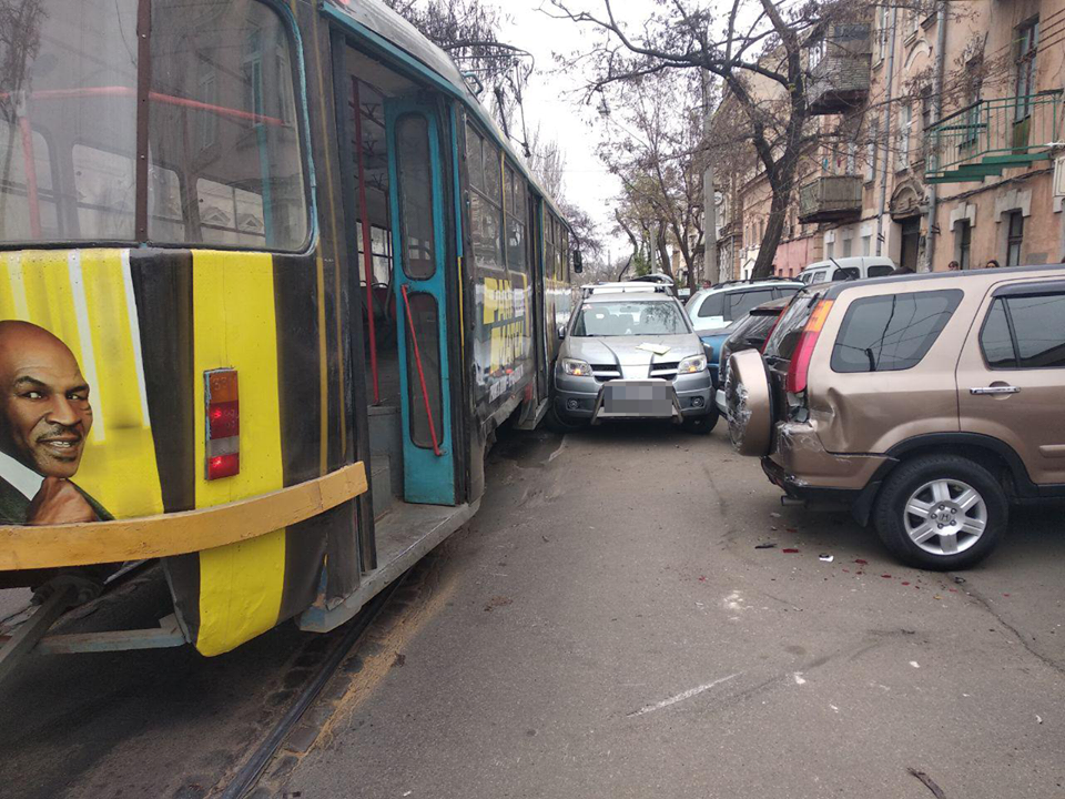 Один из автомобилей-участников ДТП оказался зажат между припаркованными автомобилями и трамваем. В итоге Повреждены 4 автомобиля и городской трамвай.