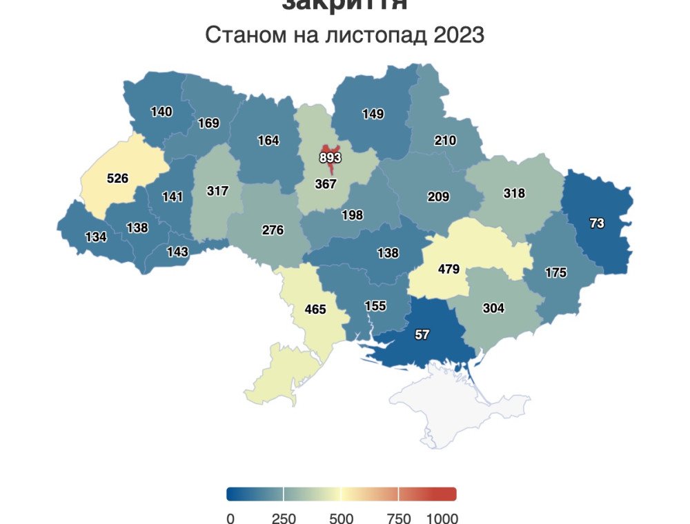 Загалом в Україні припинило працювати 6482 юрособи. Щомісяця закривається в середньому 479 фірм, що майже втричі менше, ніж у 2021-му, коли щомісяця припиняло існування 1290 компаній.