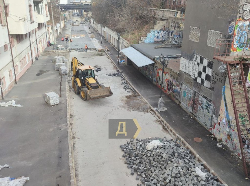 Гранітну бруківку почали укладати на проїжджій частині одеського Деволанівського узвозу, реконструкція якого триває вже понад два роки.