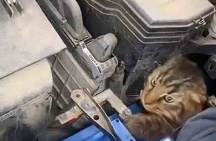 В Одессе спасатели вызволили из ловушки кота, который очевидно в поисках приключений залез под капот легкового автомобиля.