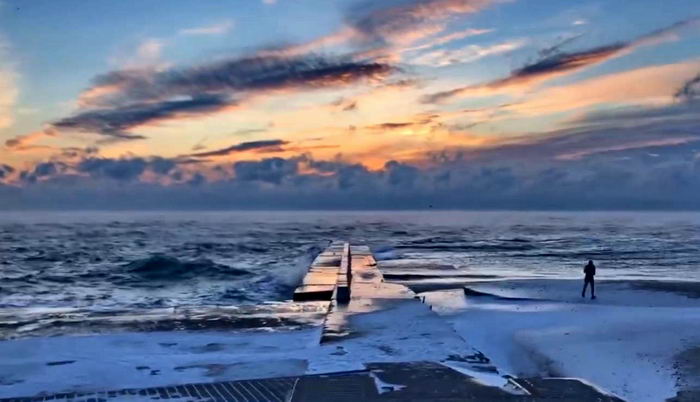 В Одессу пришла морозная погода, которая заставила воду в Черном море быстро охлаждаться. При этом, когда температура падает до отметки -10 или более, море начинает “кипеть”. Над поверхностью моря стоит густой туман от выпаривания воды из-за большой разности температуры почти в 20 градусов. Сегодня 9 января во время восхода солнца этот эффект был дополнительно подсвечен розовыми, красными и желтыми цветами. Видео из Ланжерона опубликовала наблюдательница восходов солнца Ольга Богданова.