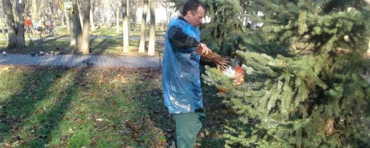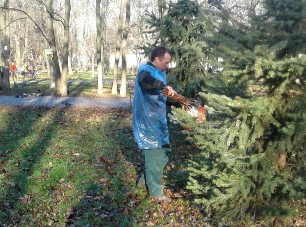 Озеленители одесского КП «Горзелентрест» приступили к работам по опрыскиванию хвойных насаждений специально разведенным раствором мела.