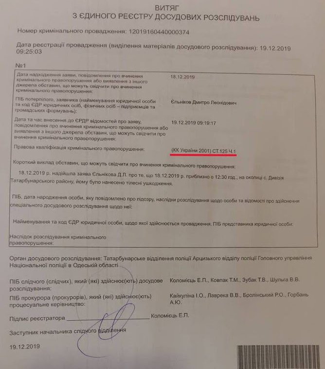 «Пьяный браконьер остановил машину возле инспектора, который был на трассе в районе села Дивизия и ждал попутную машину, чтобы отправиться в офис нацпарка. Инспектор инвалид, не имеет одной ноги. Именно он не раз выявлял в браконьерстве в нацпарке мерзавца Гайдаенко. Так вот он начал предъявлять претензии Ельникову, что тот мешает ему охотиться в Нацпарке и принялся его избивать по голове. Обороняясь у инспектора выпал протез и он не мог оказать реального сопротивления бандиту. В это время проезжала полицейская машина Татарбунарской полиции. Полицейские остановились, забрали Дмитрия в машину в Татарбунары, а пьяного бандита просто отпустили», — написал Иван Русев.