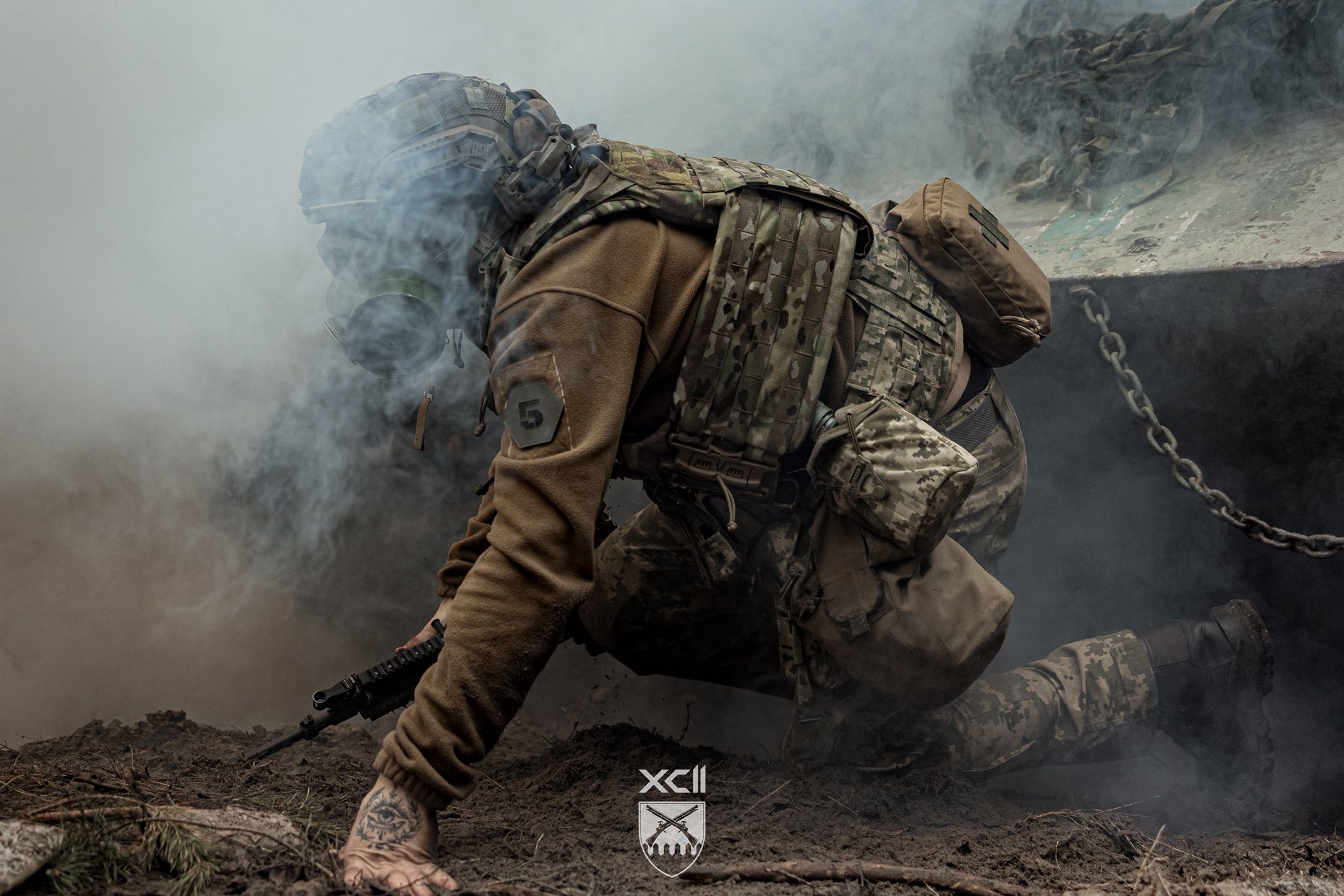 Рекрути мають пролізти під заведеною машиною, коли навколо лунають вибухи і валить дим — тому виконують це завдання у протигазах. Наступна вправа — стрибнути в окоп, коли на тебе рухається бронетехніка, а після того як вона проїде — вискочити і виконати імітацію пострілу з гранатомета.