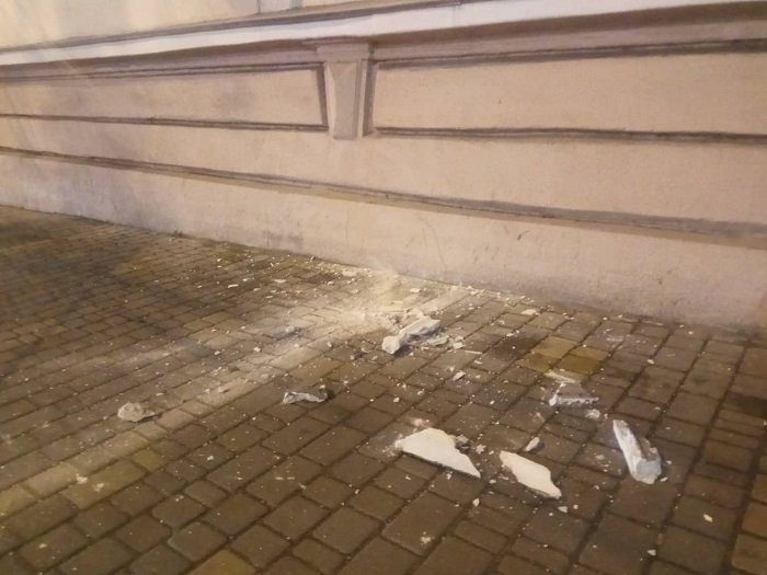 На Канатной в районе стадиона Спартак со старинного здания обрушилась часть карниза. Куски карниза упали прямо на пешеходную часть. К счастью, никто не пострадал.