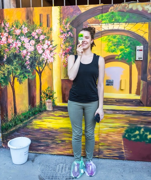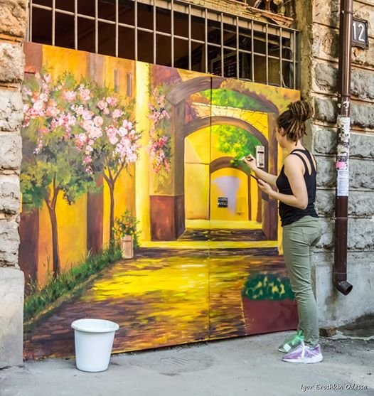 На воротах дома № 12 нарисован солнечный одесский двор с арками и котиком, цветами и прочими милыми вещицами.
