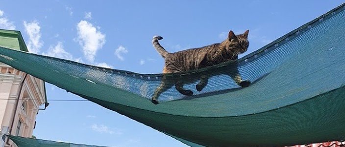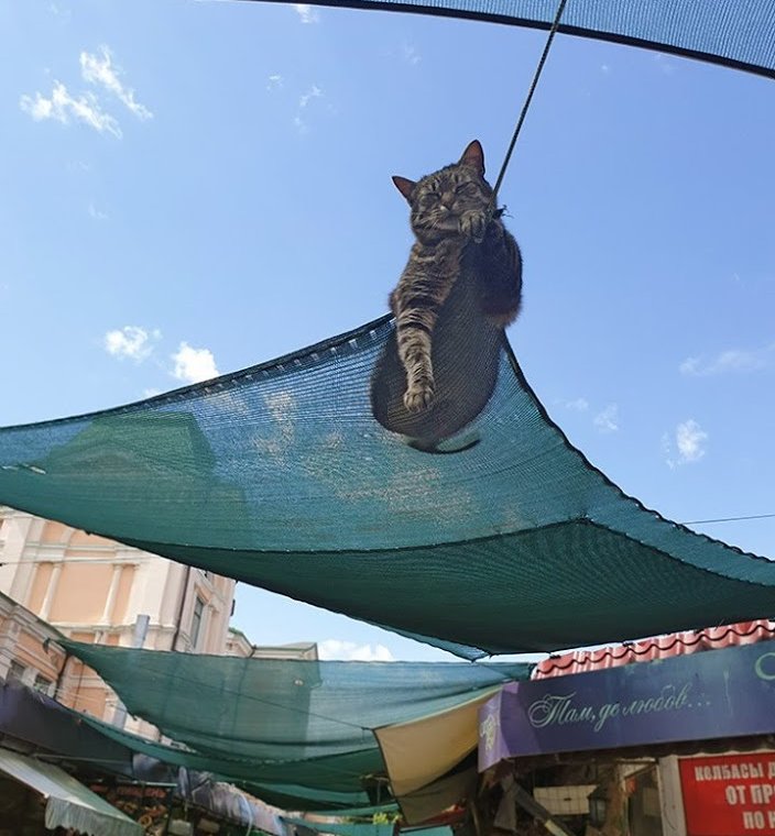 Торговцы натянули между рядами сетку, чтобы создать тень, но кот решил, что это отличное место для прогулок и отдыха. Он, как цирковой канатоходец, вальяжно ходит по веревками, сетке и смотрит на всех свысока, либо просто ложится отдыхать. Фотографиями кота поделился на своей странице в Facebook одессит Игорь Ландер.