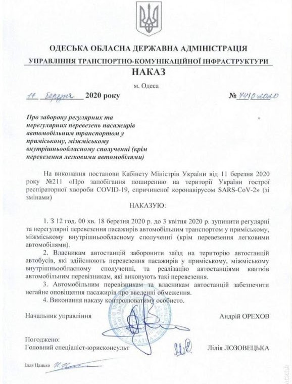 С сегодняшнего дня и до 3 апреля в Одесской области будут прекращены пассажирские перевозки на автобусах и маршрутках. Соответствующий приказ подписал начальник облуправления транспортно-коммуникационной инфраструктуры Андрей Орехов
