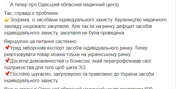 Вскоре главврач МОЗ Виктор Ляшко поделился результатами проверки на своей странице в Facebook.По его словам, на базе областного центра действительно принимают и лечат пациентов с COVID-19. Изначально этой больницы не было в списке опорных медучреждений, его включили туда дополнительно.Виктор Ляшко отметил, что проверка обнажила ряд реально существующих проблем в больнице водников. В частности, по его словам, не закуплено в достаточном количестве, средств защиты. Однако этот вопрос уже начали решать. После инспекции передали туда 600 респираторов и 200 костюмов.