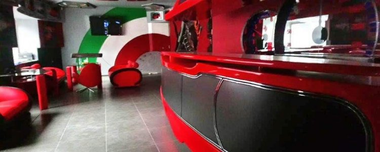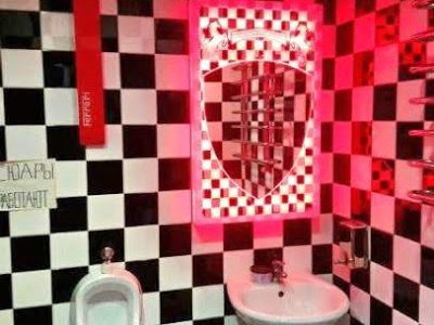 Здесь все имеет лакшери-эфект из 90-х: роскошь и элитный дизайн интерьера впечатляет, но дизайн заставит улыбнуться! Вокруг — черно-белая плитка, выложенная в шахматном порядке, красные огни и яркий свет.