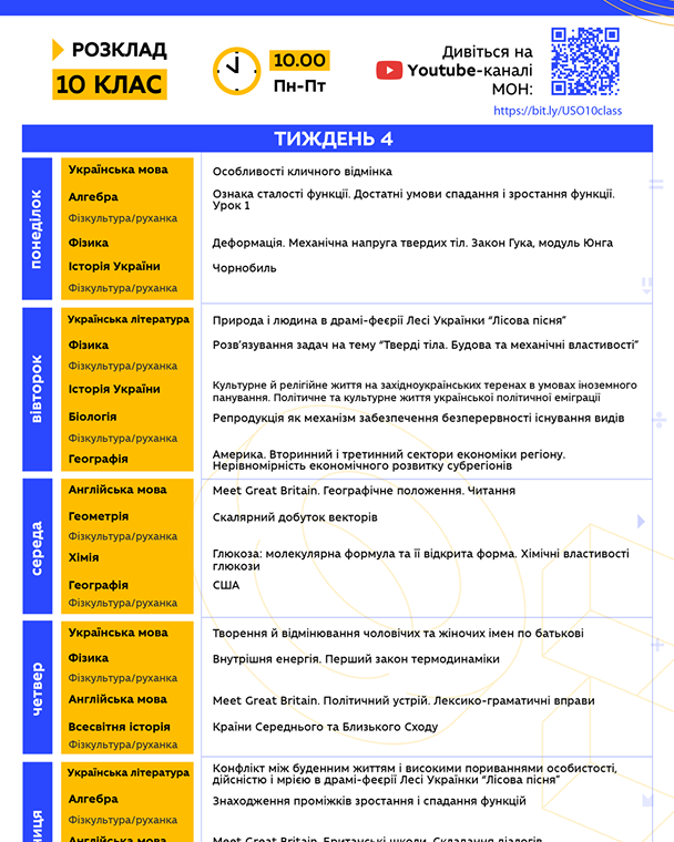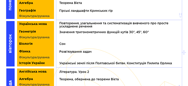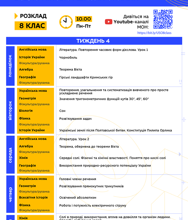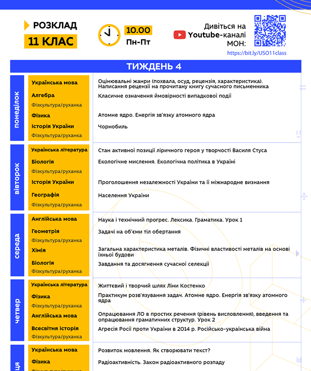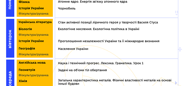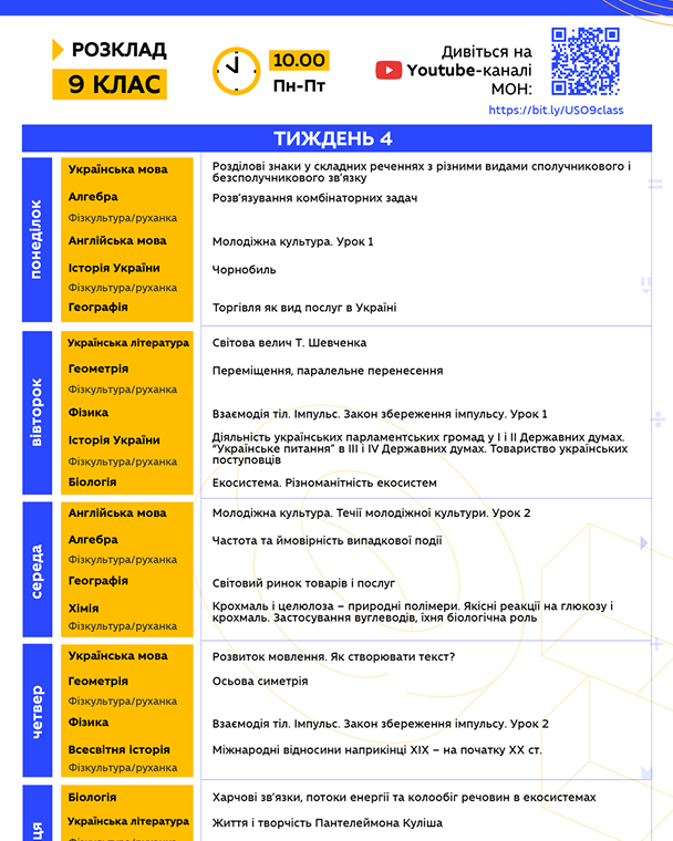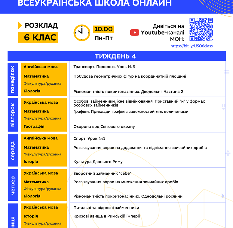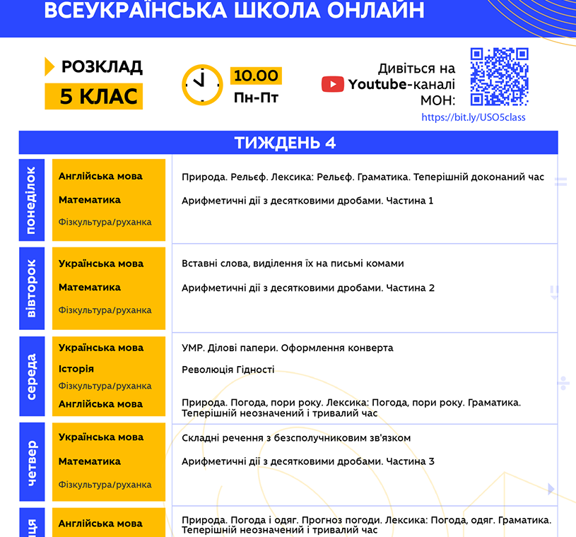 "Друзья, надеемся, что вы проснулись и уже радуетесь новому дню! Ведь уже в 10.00 стартует 4 неделя Всеукраинской школы онлайн. Все уроки на сегодня уже запланированы на YouTube МОН. Традиционно делимся с вами расписанием на неделю, где заранее указаны темы каждого урока. Также напоминаем, что для вашего удобства работают отдельные списки воспроизведения для каждого класса, просто кликайте на нужную вам ссылку…", - говорится в сообщении.