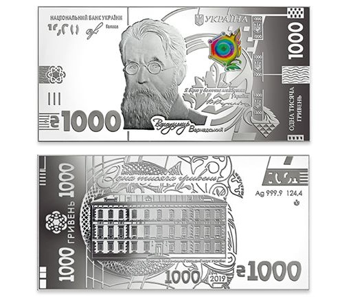 Нацбанк Украины 20 мая выпустил сувенирную банкноту из серебра, которая воссоздаёт дизайн купюры номиналом 1000 гривен образца 2019 года. Об этом сообщила пресс-служба НБУ. Украшенная голограммой сувенирная банкнота изготовлена из серебра 999,9 пробы. Её размер — 133*66*1,35 мм. Тираж — 300 штук. На лицевой стороне банкноты изображён портрет Владимира Вернадского — выдающегося учёного, одного из основателей и первого президента Украинской академии наук, созданной в 1918 году. На обратной стороне изображено здание Президиума Национальной академии наук Украины. В Нацбанке сообщили, что на первом этапе реализация банкноты произойдёт через электронные аукционы на Универсальной товарной бирже «Контрактовый дом УМВБ». Затем не реализованные на электронных аукционах сувенирные серебряные банкноты поступят для продажи через существующие каналы реализации нумизматической продукции.