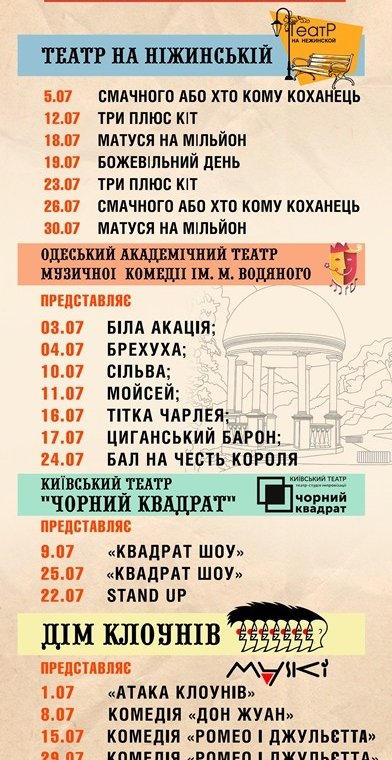 Кроме того, на сцене Летнего театра запланированы спектакли и премьеры театра на Нежинской и киевского театра «Черный квадрат».