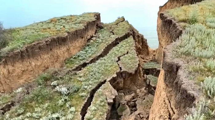Сразу за курортом Коблево на днях огромные массы грунта съехали в море. Оползень получился длинной около 700 метров и шириной 50 метров. Последствия природного катаклизма опубликовал блогер «Зоотроп».
