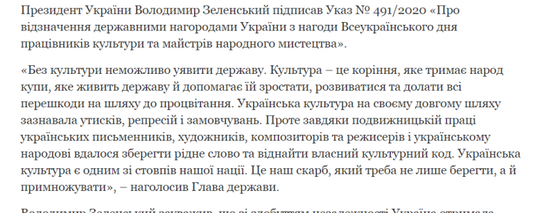 В среду, 10 ноября, президент Владимир Зеленский подписал указ под номером 491/2020 "О награждении государственными наградами Украины по случаю Всеукраинского дня работников культуры и мастеров народного искусства".