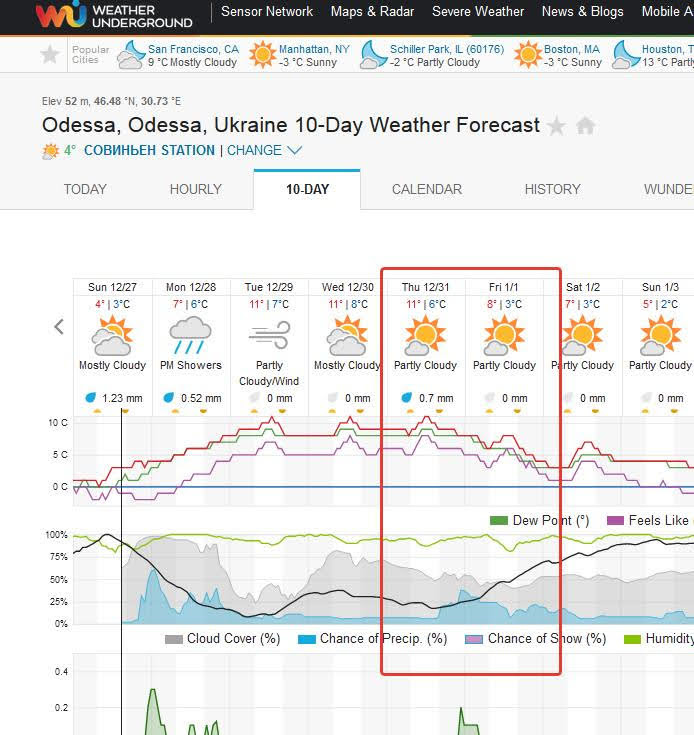Синоптики прогнозируют температуру воздуха и днем и ночью 30 и 31 декабря +9..+10 градусов, также возможны кратковременные осадки.