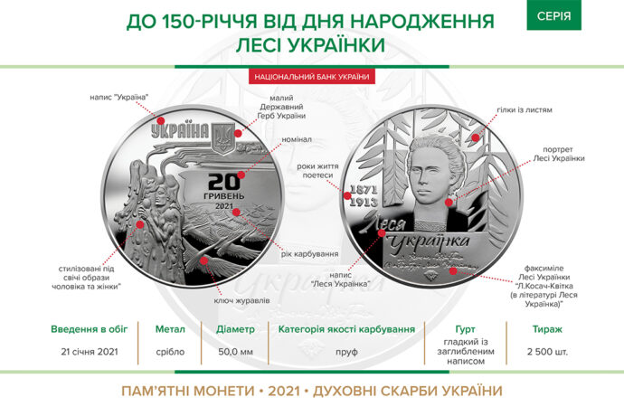 Серебряная монета номиналом 20 гривень посвящена великой украинской поэтессе, драматургу, переводчице, литературному критику и общественному деятелю Лесе Украинке (Ларисе Косач). Ее творчество наполнено глубокими патриотическими чувствами к Украине. На аверсе монеты размещены: