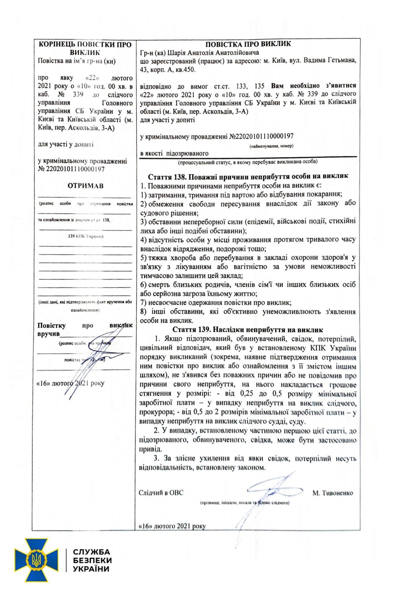 Служба безпеки України оголосила про підозру у вчиненні злочину громадянину України Анатолію Шарію. На переконання слідчих, він здійснював протиправну діяльність на шкоду національній безпеці України в інформаційній сфері. Є підстави вважати, що Анатолій Шарій діяв на замовлення іноземних структур. Про це інформує прес-центр відомства (СБУ оголосила про підозру відомому проросійському пропагандисту Шарію (ssu.gov.ua)).