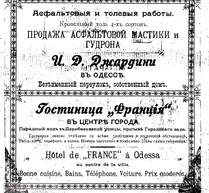 Вот как описывали гостиницу "Империал" (здание не сохранилось, размещалась на ул. Дерибасовской, на месте нынешней ярмарки) в рекламном проспекте: "все номера светлые, высокие, комфортабельная обстановка, новые матрацы, новое белье, безукоризненная чистота и порядок. Рекомендуется семейным и коммерсантам. При гостинице ванная с разными приспособлениями".