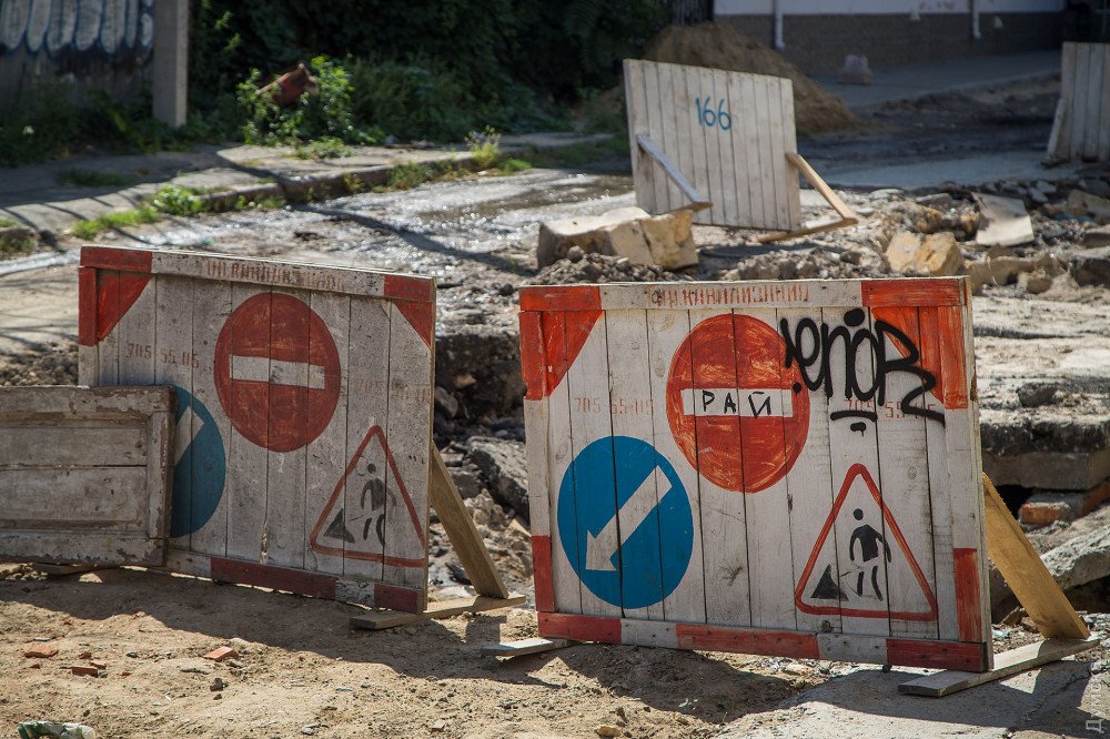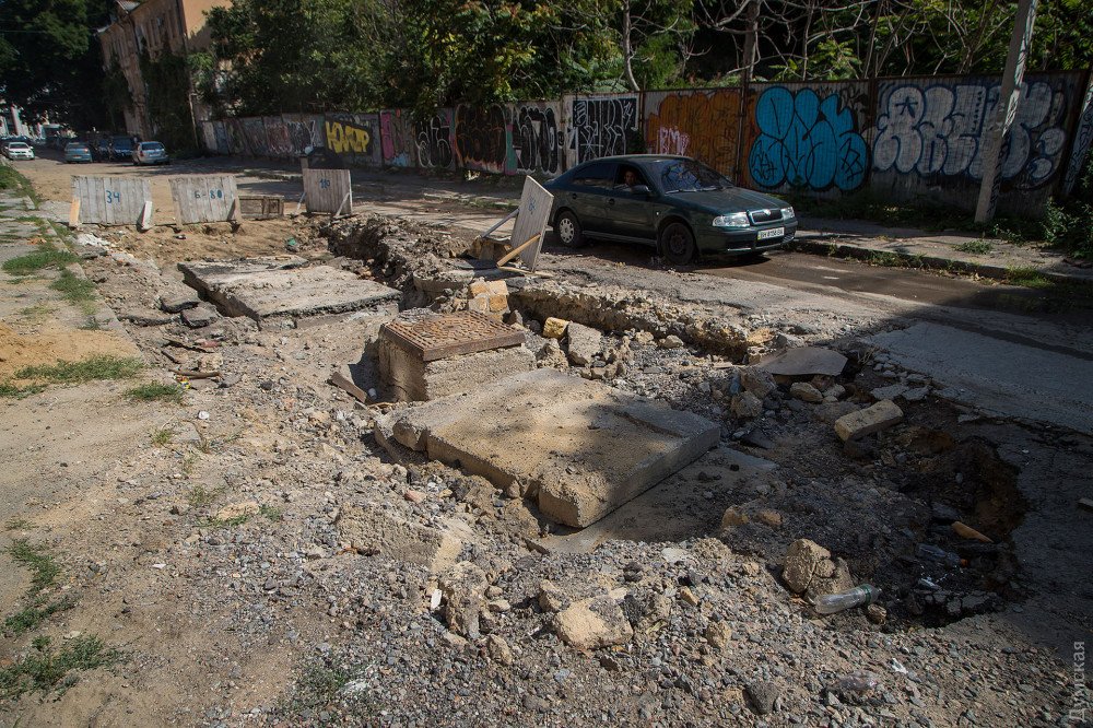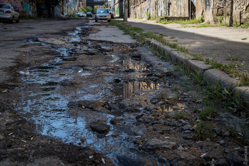 Коллектор до конца не отремонтирован, как и дорожное покрытие: огромные дыры просто засыпали щебнем, который смоет первым же сильным дождем. Сейчас здесь течет черный ручей с характерным запахом.
